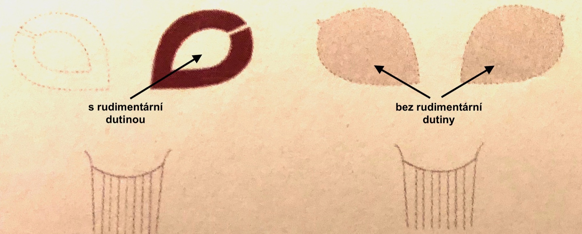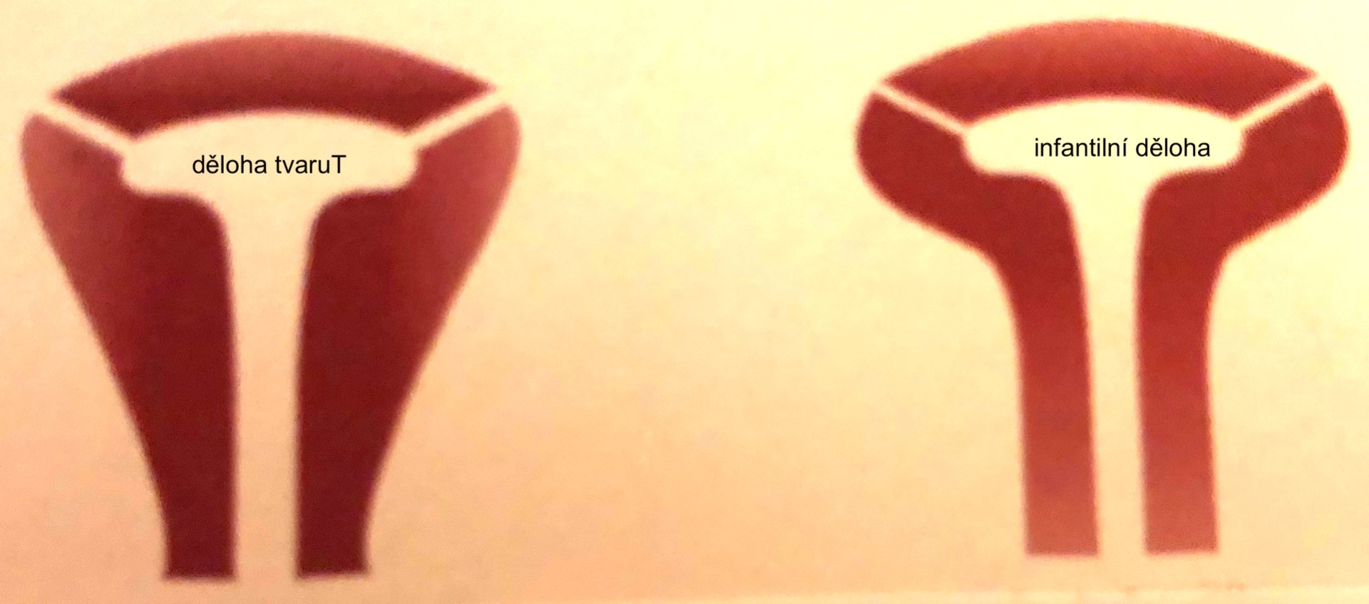 - U prvního typu je děložní dutina tvaru T úzká, protože tato děloha má silnější děložní stěnu, ale je zachovaný normální poměr velikosti děložního těla a hrdla 2/3 : 1/3.