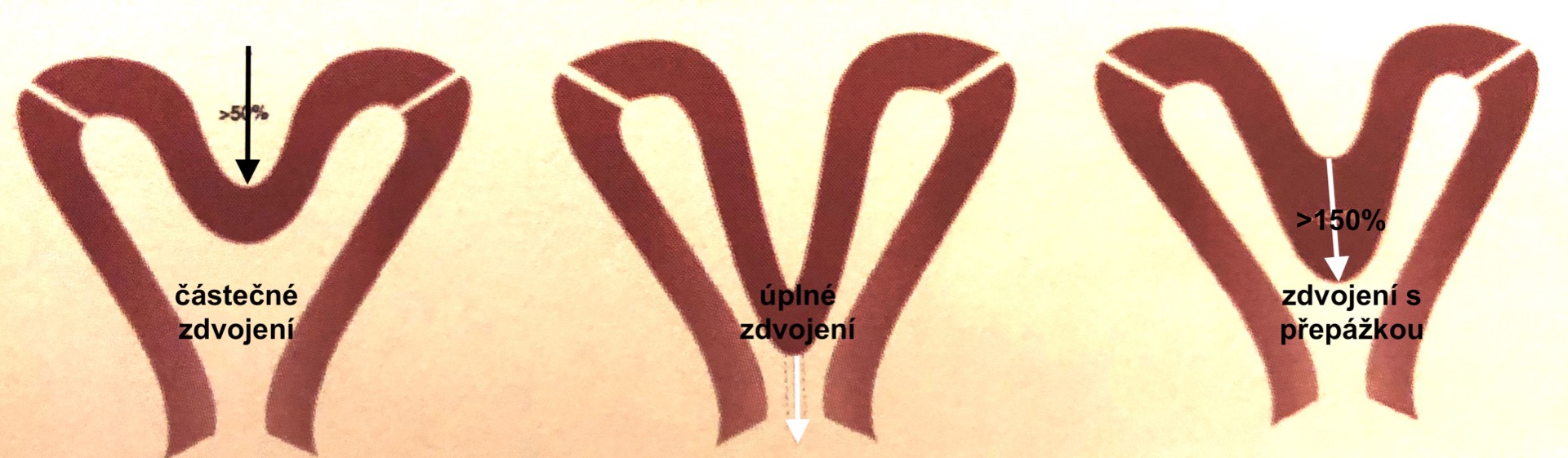 - Děloha se zdvojeným děložním tělem-uterus bicorporeus (dřívější název uterus bicornis-dvojrohá)